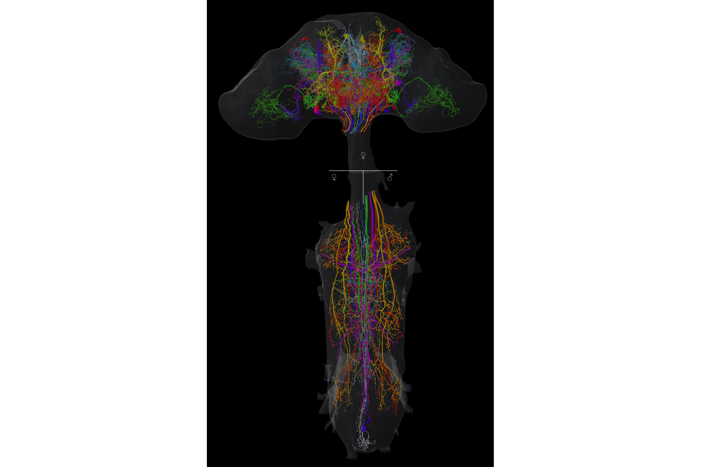 Erstmals haben Wissenschaftler/-innen der Universität Leipzig und anderer Forschungseinrichtungen umfassende Erkenntnisse über das gesamte Nervensystem der Fruchtfliege (Drosophila melanogaster) erlangt. Im Fachjournal „Nature“ veröffentlichten sie gerade die erste Studie, die im Detail die Nervenzellen (Neurone) beschreibt, die das gesamte Nervensystem der erwachsenen Fruchtfliege durchspannen. Außerdem haben sie erstmals die Gesamtheit der Verbindungen im Nervensystem (Konnektom) eines weiblichen und eines männlichen Tieres verglichen und Unterschiede festgestellt.