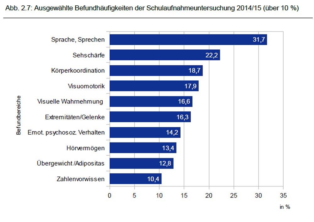 Die Probleme, die bei der Schulaufnahmeuntersuchung festgestellt werden, erzählen davon, dass viele Kinder eine falsche Kindheit erleben – ohne die nötigen Anregungen zu körperlicher und geistiger Bewegung, ohne sprachliche Herausforderungen. Viele verbringen ihre Tage mit den technischen Verdummungsgeräten unserer Zeit. Ergebnis: Bei 31,7 Prozent der Kinder werden Sprachprobleme festgestellt, bei 22,2 Prozent gibt es schon Probleme mit der Sehschärfe, 18,7 Prozent haben Probleme mit der Körperkoordination usw. Selbst diese Zahlen zeigen, dass es fast immer um ein Fünftel der Kinder geht, die in ihren frühen Jahren ausgegrenzt waren, nicht mitgetobt haben, weil sie vorm Bildschirm ruhiggestellt wurden. Und genau da lernt es eben nicht richtig sprechen noch denken noch neugierig sein. Sozial interagieren schon gar nicht.