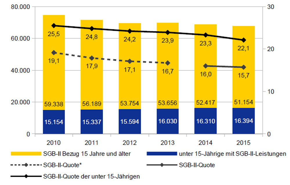 „In Leipzig sank der Anteil der unter 15-Jährigen, die auf Leistungen gem. SGB II angewiesen waren in den letzten Jahren kontinuierlich, ihre absolute Zahl stieg allerdings seit 2010 an. Insgesamt war 2015 noch mehr als jede/-r fünfte Leipziger/-in unter 15 Jahren auf diese Transferleistungen angewiesen. Stadtweit betraf das insgesamt 16.394 Kinder und Jugendliche“, so der Bildungsreport.