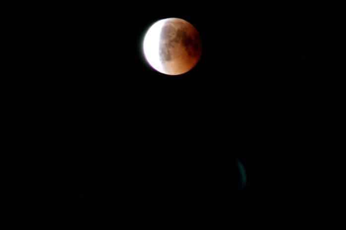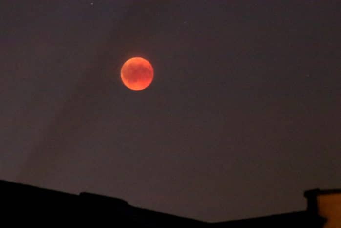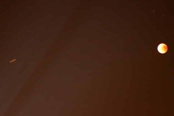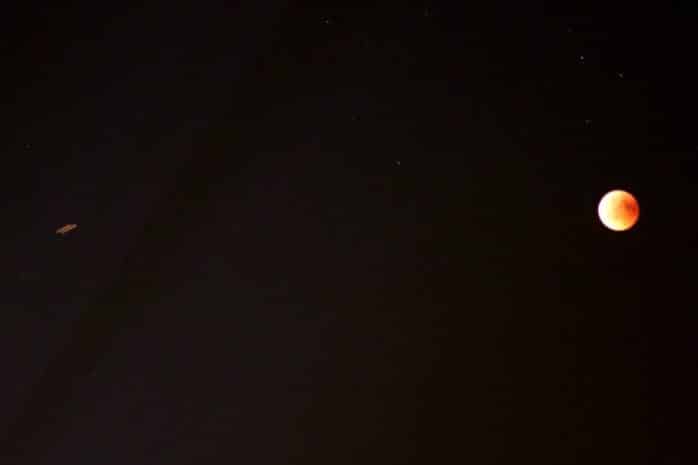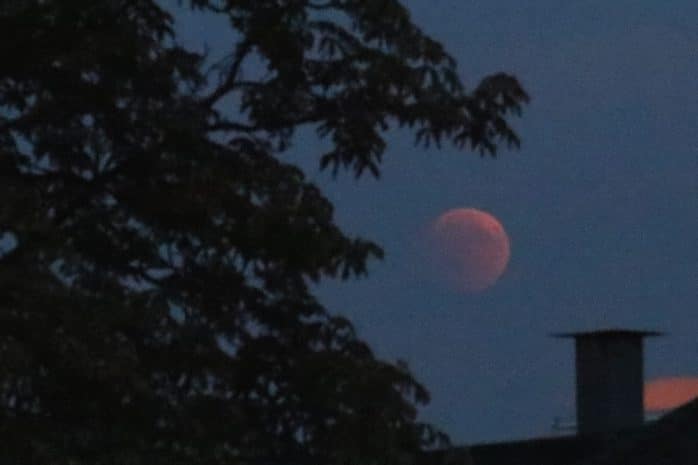 Der Abend des Himmelsereignisses des Jahrhunderts begann in Leipzig mit überraschend hartnäckigen Wolken. Ein kurzer Regen, hereinbrechende Dunkelheit und der Ausdunst einer, trotz Kurzgewitters, weiterhin verstaubten Stadt, gaben am Ende doch noch einen Teil des Himmels frei. Und damit die Möglichkeit, den roten Mond auf seiner Bahn zu fotografieren. Dass dann auch noch die ISS mit dem Deutschen Alexander Gerst an Bord vorbeiflog und sich der Mars zumindest als kleiner Leuchtpunkt zeigte, gehörte zu den kleinen Überraschungen einer Nacht mit den Augen zum Firmament.