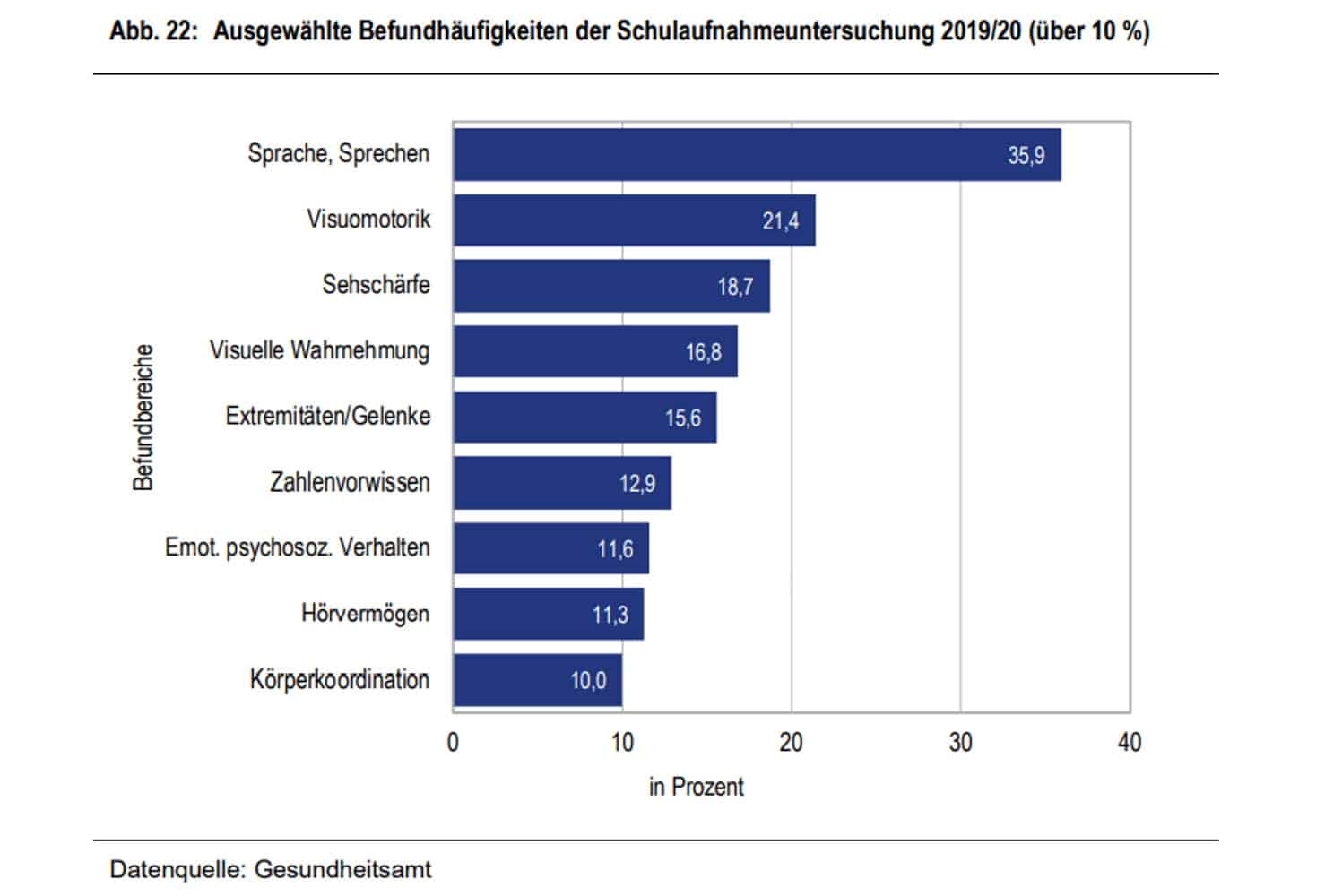 Auch Probleme in der Körperkoordination und in den Bereichen Visuomotorik, Defizite in der selektiven Wahrnehmung und Probleme beim Zählen kamen bei diesen Kindern mehr als doppelt so häufig vor. Ebenso waren Kinder, die von staatlicher Grundsicherung lebten, deutlich häufiger übergewichtig. Auffälligkeiten bei der Schulaufnahmeuntersuchung konnten in einen klaren Zusammenhang mit einer geringeren Teilhabe an sozialen und kulturellen Angeboten gebracht werden.“