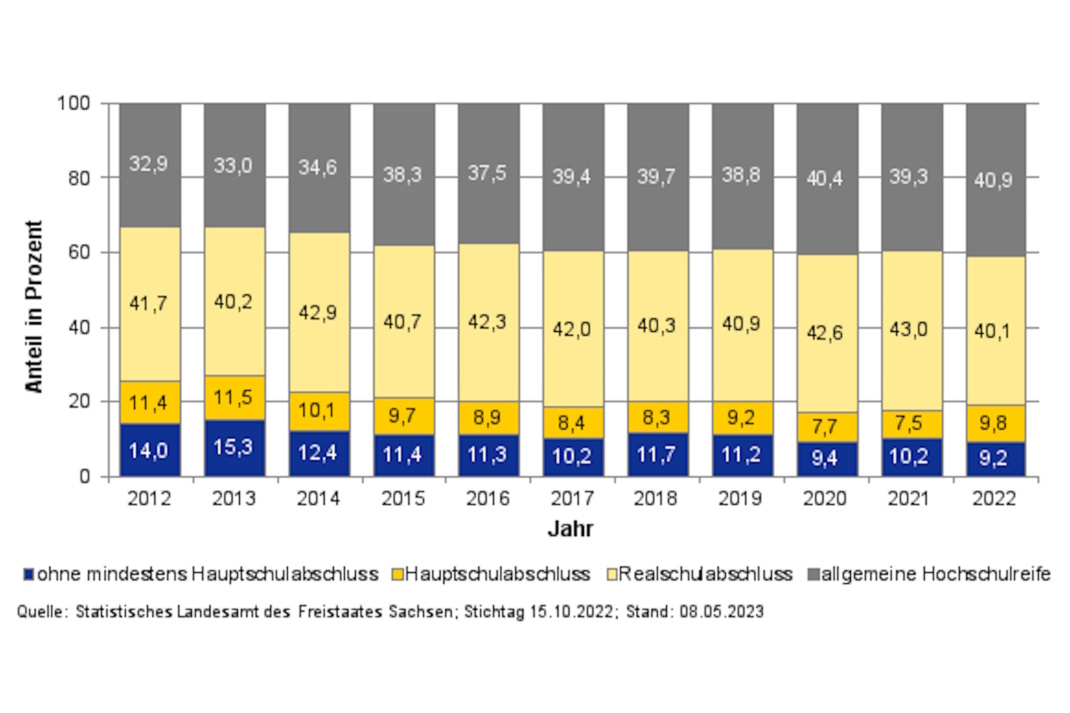 Das Ergebnis, so das Amt für Schule: „Laut der aktuellen Schulstatistik des Statistischen Landesamtes Sachsen zeigten sich differenziert nach Schularten im Schuljahr 2022/23 unterschiedliche Abschlussquoten: An den Gymnasien erreichten 92,4 % der Absolventinnen und Absolventen die allgemeine Hochschulreife, 7,3% einen Realschulabschluss. An den Oberschulen legten 73,5 % der Schülerinnen und Schüler einen Realschulabschluss ab, 17,6 % einen (qualifizierenden) Hauptschulabschluss, 8,9 % verließen die Schule mit einem Abgangszeugnis.