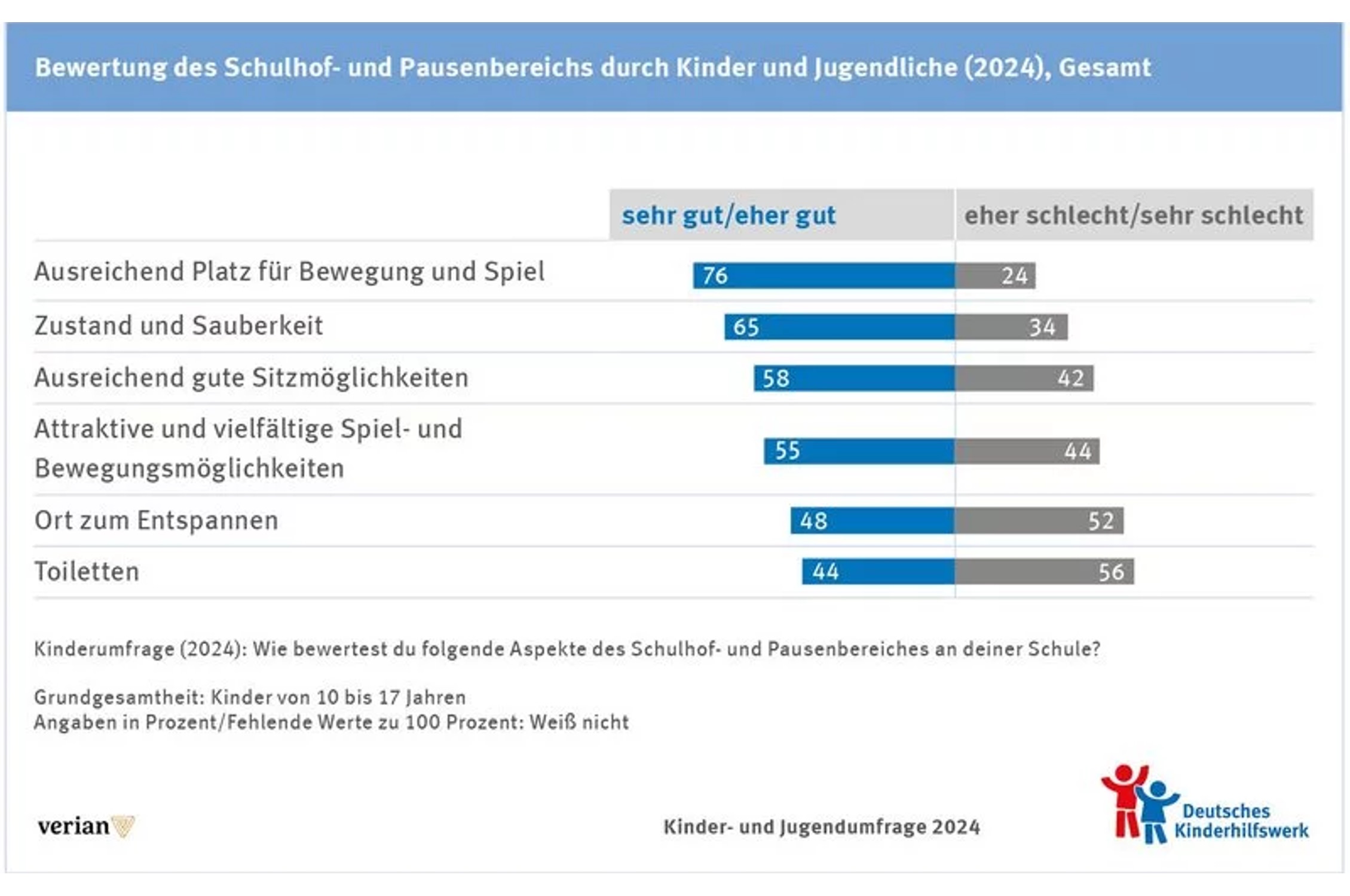 Dass es dort einen guten Ort zum Entspannen gibt, meinen hingegen nur 48 Prozent der Befragten. Und während Zustand und Sauberkeit des Schulhof- und Pausenbereiches insgesamt von rund zwei Dritteln (65 Prozent) für gut befunden wird, sehen das bezogen auf die Schultoiletten nur 44 Prozent so.