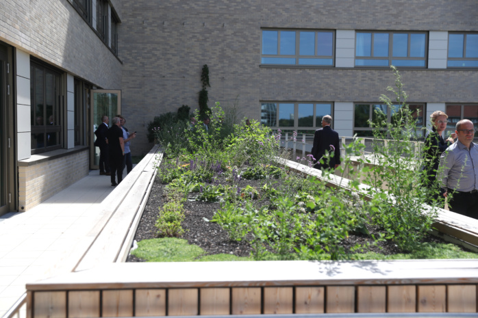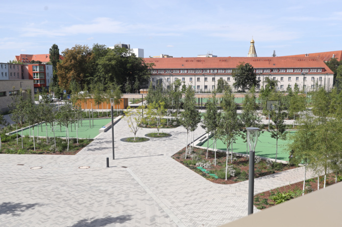 Der öffentliche Vorplatz kann zu Schulzeiten als ergänzende Pausenfläche genutzt werden. Direkt an der Ecke zur Prager Straße bleibt das sich über die vergangenen Jahre entwickelte Biotop erhalten und bildet ein grünes Entrée. Fassadenbegrünung, Hochbeete und der sehr grün gestaltete Pausen- und Sportbereich geben der Natur Raum.