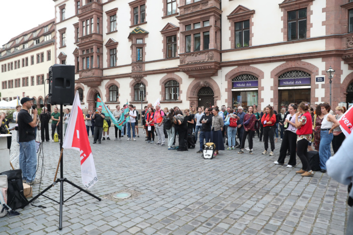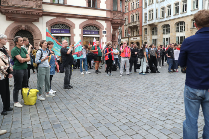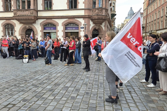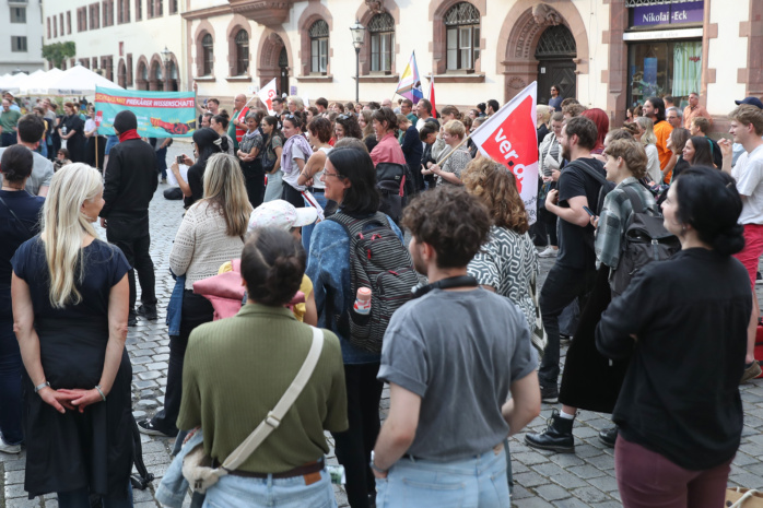 Als die Anmeldezahlen für diese Zusammenkunft die 100 überschritt, pochte die Uni-Leitung nach Verdi-Angaben auf die unbedingte Einhaltung der Kapazitätsgrenze. Nur einen Tag vor der seit Wochen angekündigten Versammlung kippelte damit der Austragungsort. Kurzerhand entschieden sich die Beteiligten daher, in den öffentlichen Raum auszuweichen. So wurde aus einer Belegschaftsversammlung eine öffentliche Kundgebung auf dem Nikolaikirchhof.