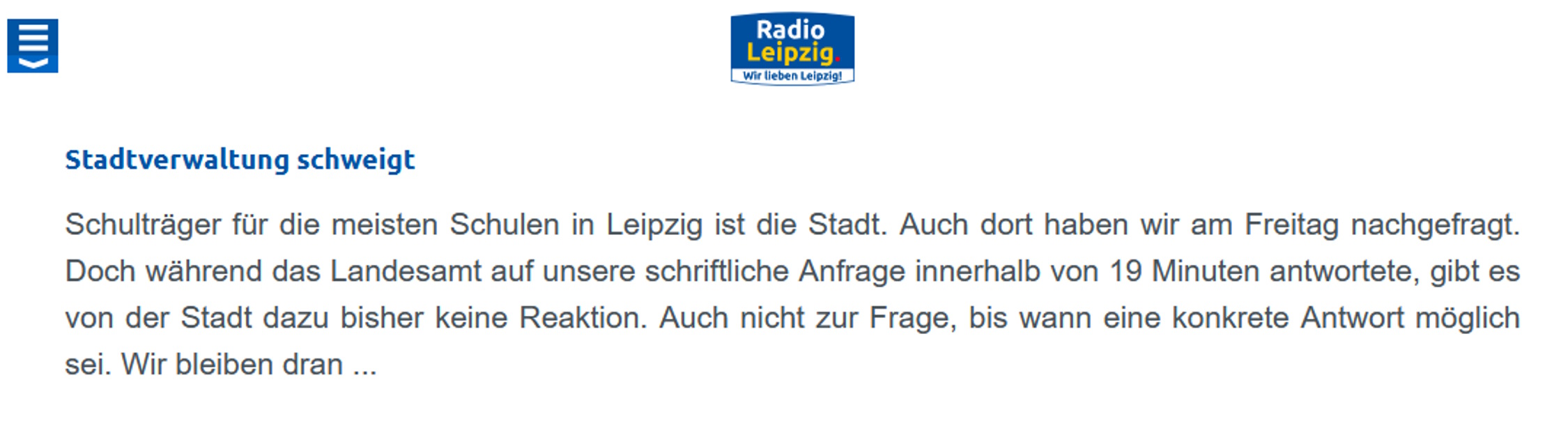 Doch schon das stimmte nicht, wie das Amt für Schule soeben noch einmal schriftlich öffentlich machte, denn tatsächlich wurde die Anfrage von der Stadt beantwortet. Während Radio Leipzig bis heute behauptet: „Stadtverwaltung schweigt“.