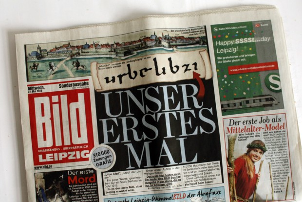 So ungefähr muss das gewesen sein. So viele 1.000-Jährige hat ja Leipzig nicht zu feiern. Und Sonderausgabe können sie bei “Bild”. Ist ja so eine Art Fußball-WM ohne Fußball (eigentlich doch mit Fußball – “Bild” geht einfach nicht ohne Fußball). Hab ich mich also mal für drei Stunden ausgeklinkt aus dem Redaktionsbetrieb … Na ja. Ist jetzt geschwindelt. Wollte ich eigentlich erst, um die anderen zu ärgern. Da hätte ich mich mit Kaffee und Croissant ins Grüne gesetzt und emsig gelesen.