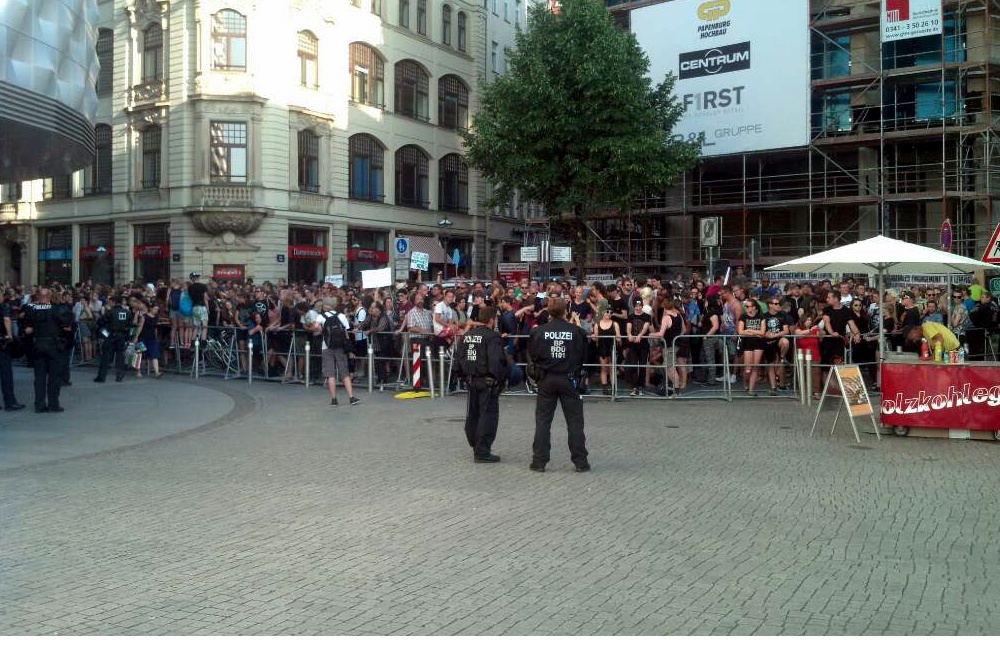 Legida und Pegida werden heute irgendwie gründlicher unter die Lupe genommen. Ein bisschen wie vor dem Festivalgelände – Taschen auf, mal reinschauen, was da so alles drin ist. Allmählich sammeln sich auch die Teilnehmer der Legida & Pegida-Veranstaltung, gegen 18:40 Uhr noch recht wenige, vielleicht 40, 50 – nein, natürlich 5.000. Aber was nicht … es sei denn, der See hat heute doch zu sehr gelockt und der Namen L-IZ hat nicht so richtig “gezogen”. Offenbar doch wenige Abonnenten drunter.
