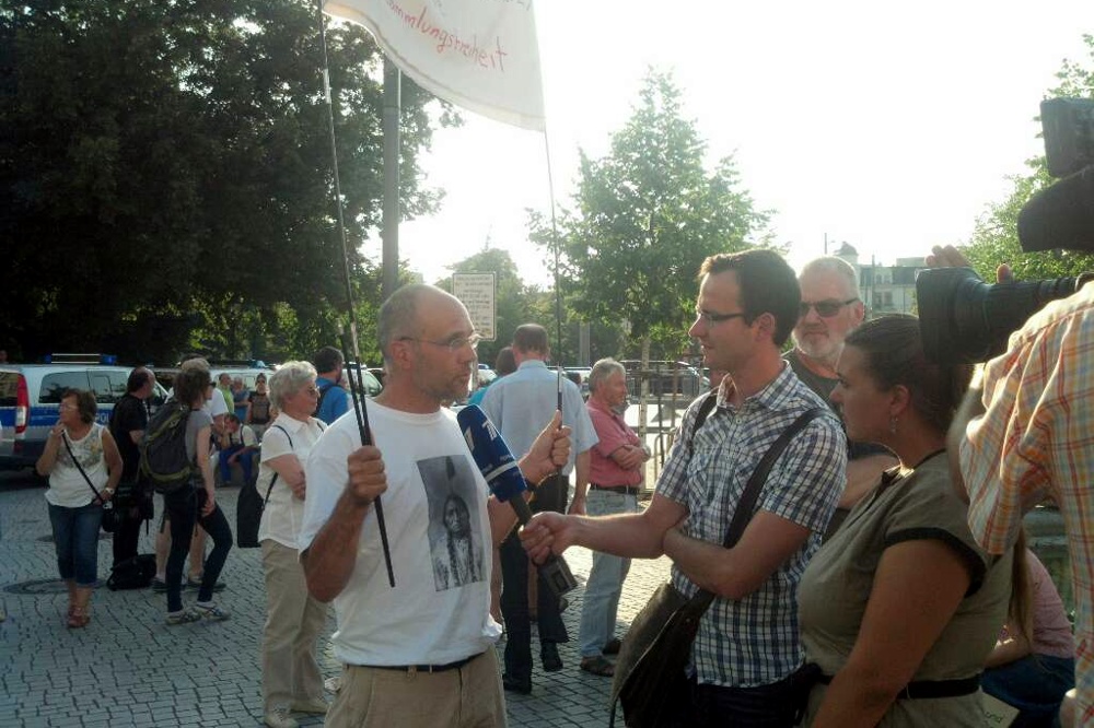 Fehlt der Bus aus Dresden? 150 sind nun bei Legida eingetrudelt, von der Gegendemo hört man “Nazis raus”. Ein Legidateilnehmer erzählt einem russischen Sender was über Eliten in Deutschland. Die Kollegen scheinen sich zu freuen, dass sie hier mal frei berichten dürfen.