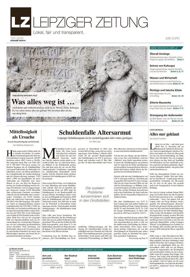 Weitere Themen sind u.a.: Schuldenfalle Altersarmut – Leipziger Rentner haben eine geringere Lebensqualität – Seiten 1 und 3 +++ Gesetzlos und arm: Das soziale Umfeld prägt Kriminalität entscheidend mit Seiten 1 und 10 +++ Helmut Schmidt verpaffte – Eine Karikaturkondolenz von Schwarwel – Seite 2 +++ Rätselhafter Anstieg: Immer mehr Kinder haben Diabetes Typ 1 +++ Für legale Graffiti: Eine Leipziger Koordinierungsstelle wird aufgebaut – Seite 2 +++ Kaufkraft in Leipzig steigt leicht: Neuer Handelsatlas der IHK Leipzig belegt auch Zunahme der Großverkaufsflächen – Seite 2 +++ Der Stadtrat tagte: Was Stadtpolitiker verstimmte, bestimmten und abstimmten – Seite 4 +++ Damit es nicht nass werde: Freistaat investiert in Hochwasserschutz – Seite 5 +++ Innovation als Motor: Sachsens Wirtschaft boomt – Seite 5 +++ Faire Vergütung gewünscht: Das Urhebervertragsrecht hat Anpassungsprobleme – Seite 5 +++ Steuerbetrug und Selbstanzeigen: Wenn das Finanzamt zweimal klingelt – Seite 6 +++ Der Bau kann beginnen: Gohlis bekommt eine Moschee – Seite 6 +++ Mitarbeiterin der Woche: Im Interview Ganna Renkachyshska vom EMP-Laden – Seite 8 +++ Nichts geht über Kontrolle: Kulturgutschutzgesetz wird vom Kunsthändlerverband kritisiert – Seite 8 +++ Hamburg, Mon Amour – Ein Reisebericht aus Hamburg – Seite 9 +++ Ein Fahnenstreit – Warum die Roma-Flagge nicht vorm Rathaus gehisst wird +++ Seite 10 +++ Vom Fischteich zur Hafenstadt: Die Entwicklung des Leipziger Gewässernetzes – Seite 14 +++ Culture-topia: Politik der Verdächtigung – Seite 16 +++ Zum Zeichnen angestachelt: Künstlerin Elisabeth Wolf entdeckt die Malerei – Seite 18 +++ Clash der Generationen: Mozart-Oper polarisiert noch heute – Seite 18 +++ Eine Herkulesaufgabe: Wie das Thomaskantorat ausgefüllt werden muss – Teil 2 des Interviews mit Thomaskantorat-Geschäftsführer Stefan Altner – Seite 19 +++ Kulturtipps der Woche – Seite 20 +++ Bewegungsmelder: Sieben Siege und eine Niederlage: L.E. Volleys haben Interessantes vor – Seite 22 +++ Wochenende: Dagobert Dachs und Willibald Wiesel sowie Schwarwel zur Asylpolitik – Seite 23 +++ Wochenende: Bilderrätsel und Verkaufsstellen – Seite 24 +++