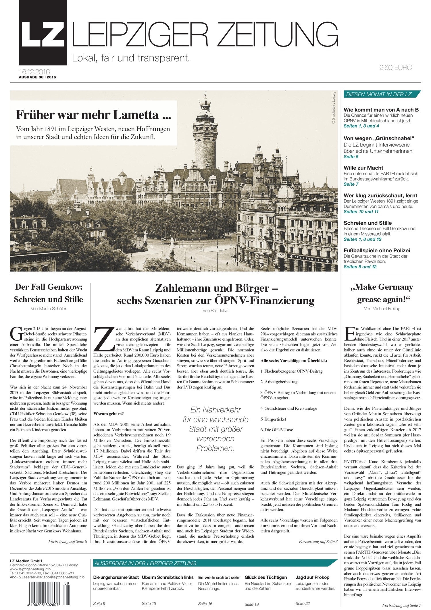 Ebenfalls in dieser Ausgabe: “Von meinem Glück etwas abgeben” – zwei Leipziger Sportler fördern den Läufernachwuchs privat. Christian Prokop – eine “dilettantische” Suche nach dem neuen Bundestrainer aus Leipzig. Eine Geschichte ohne Gewinner – eine Reportage aus dem Gerichtssaal zu einem Missbrauchsfall. Ein Fußballspiel ohne Polizeieinsatz – das Institut B3 auf der Suche nach der urbanen Gewalt in Leipzig. Schreien und Stille: Der Anschlag auf Sachsens Justizminister Sebastian Gemkow und die Folgen. Der Stadtrat tagt: Die wichtigen Entscheidungen im Leipziger Kommunalparlament. “Make Germany grease again” – die Partei DIE PARTEI Leipzig meldet sich zur Machtübernahme 2017 in einem ausführlichen Interview zu Wort. Und Ilse Schnickenfittich findet “Hoffnung ist immer” (Satire).