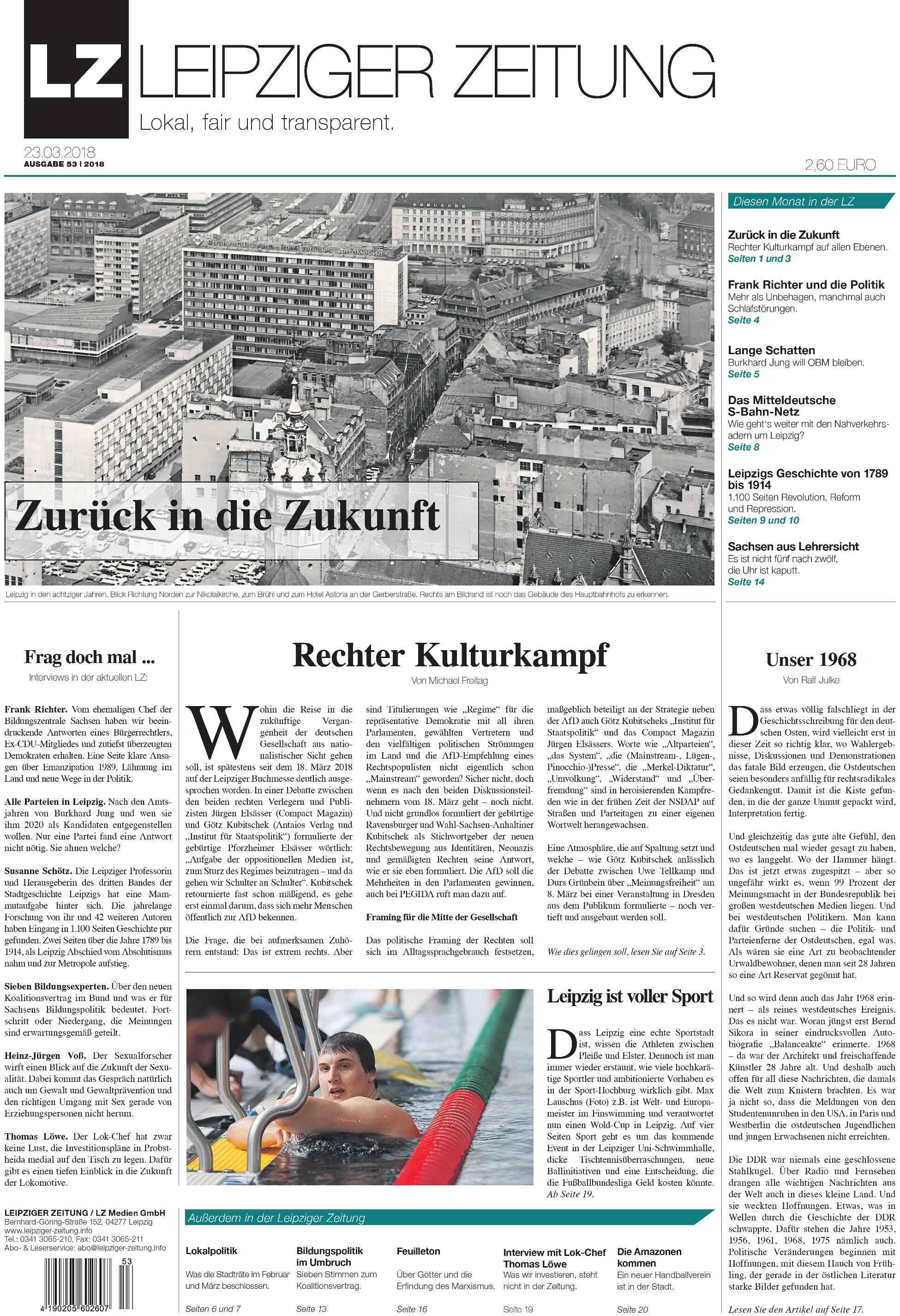 Also: Briefkasten aufmachen am Freitag, den 23.03.2018, Zeit nehmen und auf geht’s. Oder beim Szenehändler kaufen gehen: Denn die neue „Leipziger Zeitung“ gibt es jetzt wieder da, wo man noch gute Zeitungen kaufen kann – mit Timmi Transport sind die ersten Exemplare schon heute Abend mit dem Fahrrad unterwegs.