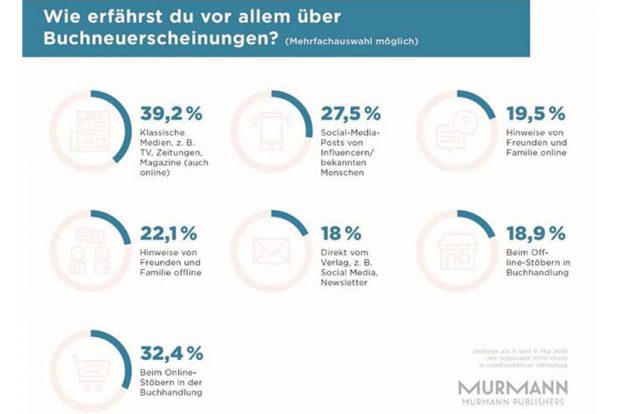 Eine von Murmann beauftragte aktuelle Umfrage zeigt: Die Deutschen erfahren von Buchneuheiten vor allem über klassische Medien, also TV, Zeitungen und (Online)-Magazine – das geben 39,2 Prozent der Befragten an (Mehrfachnennung möglich).