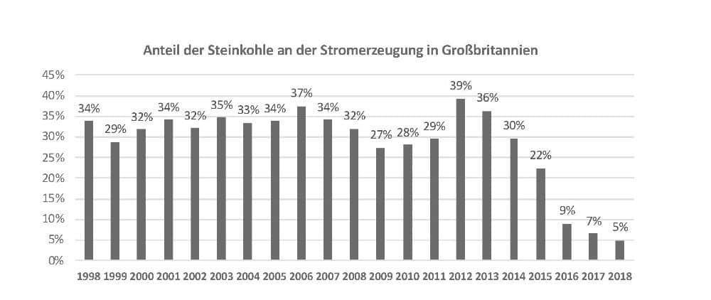 Danach ist der Anteil der Kernenergie an der Stromerzeugung im Zeitraum von 2008-2017 von 13 % auf 21 % gestiegen. Im Zusammenhang mit der CO2-Bepreisung wäre dagegen sinnvoll darzustellen gewesen der Zeitraum zwischen 2012-2018, da erst 2013 ein CO2-Preis (Carbon Price Floor) auf die fossilen Energieträger zur Stromerzeugung in Großbritannien eingeführt wurde. Dieser CO2-Preis hat zur drastischen Reduktion der Steinkohle an der Stromerzeugung (Abbildung 2) und damit zu der hohen Reduktion an Treibhausgasemissionen in Großbritannien geführt. In diesem Zeitraum ist der Anteil der Kernenergie nahezu konstant geblieben (Abbildung 1).