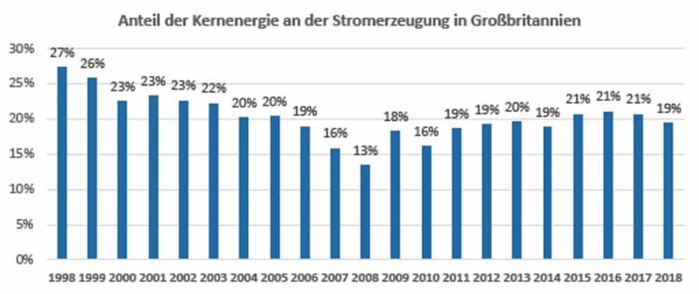 Die folgende Abbildung stellt die tatsächliche Entwicklung des Anteils der Kernenergie in UK gemäß der von der CDU angegebenen Quelle dar.