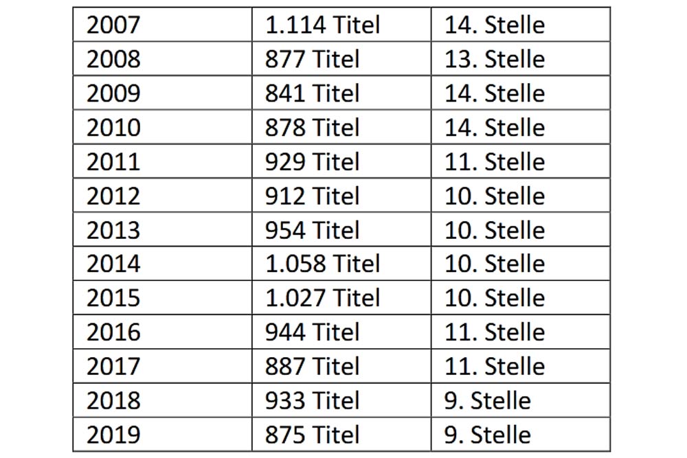 Aber zurück zur Titelzahl. Die Tabelle zeigt recht eindeutig, wie die Titelzahl ab 2014 unter die 90.000er-Marke rutschte, ab 2018 dann auch unter die 80.000er-Marke. Und die Jahre 2016/2017 zeigen auch hier einen starken Rückgang, der darauf hindeutet, dass viele Verlage ihre Titelproduktion oft auch schon vorsorglich zurückgefahren haben, lieber Rücklagen bildeten und vor allem vermieden, die VG-Wort-Überweisungen in neuen Büchern zu binden.