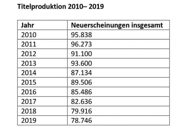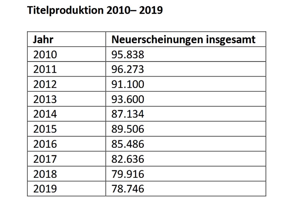 Natürlich war das Gerichtsurteil zu den Vergütungen der VG Wort nicht der einzige Grund für die Geschäftsaufgabe. Denn andere Statistiken zeigen nun einmal auch, dass auch andere Entwicklungen die Arbeit der Verleger/-innen erschwert haben. Was dann nicht immer zur Aufgabe des Verlages führt, aber zur deutlichen Drosselung der Buchproduktion. Das ist schon seit 2012 zu beobachten. Vorher strebte die deutsche Jahresproduktion an Titeln immer weiter der 100.000er-Marke zu und nicht nur Rezensenten fragten sich: Wer liest denn das alles überhaupt noch?