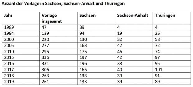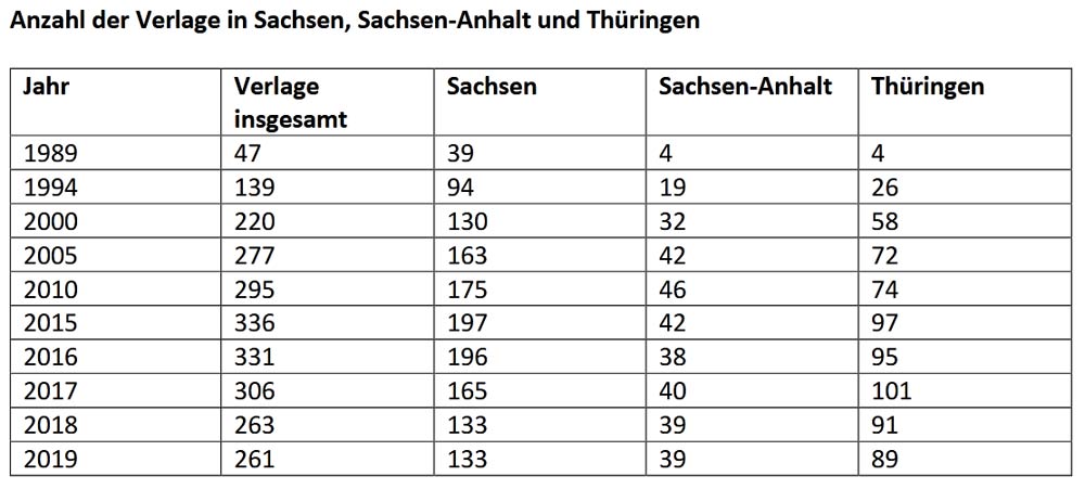 Als dann das Urteil kam, erwischte es auch viele Verlage in Mitteldeutschland auf dem falschen Fuß. Das macht die Statistik zu den mitteldeutschen Verlagen sichtbar: In den entscheidenden Jahren 2017 und 2018 meldeten fast 70 Verlage ein Ende ihrer Tätigkeit. Allein in Sachsen waren es 63, nachdem die Zahl der Verlage in den Vorjahren immerfort gewachsen war.