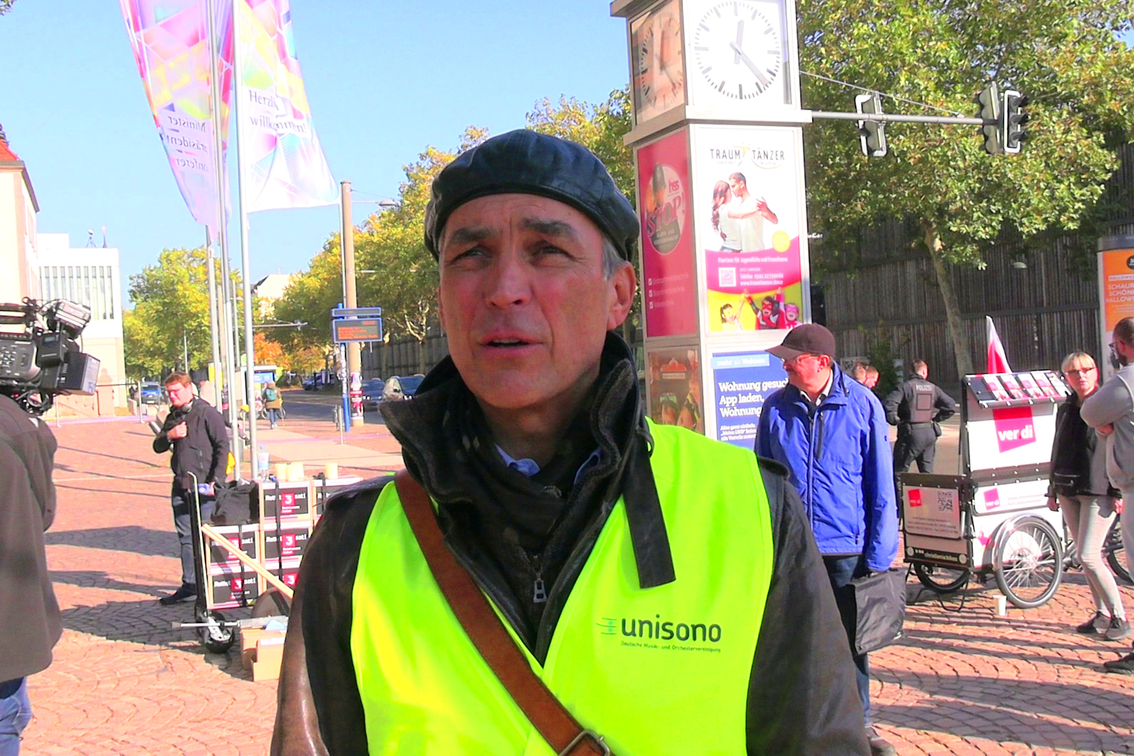 Johannes Winkler, Leipziger Orchestermusiker und Organisator der Mahnwache, sagte uns: „Ich bin Leipziger Musiker im MDR Sinfonieorchester und bin heute hier bei der Aktion ‚Rettet 3sat, rettet unsere Kultur‘. Ich spreche natürlich auch als Leipziger Musiker, weil Leipzig ist eine Musik-, Kultur-, Kunst- und Medienstadt und genau diese Vielfalt bildet 3sat ja schon seit Jahrzehnten ab. Diese Vielfalt muss erhalten bleiben.“