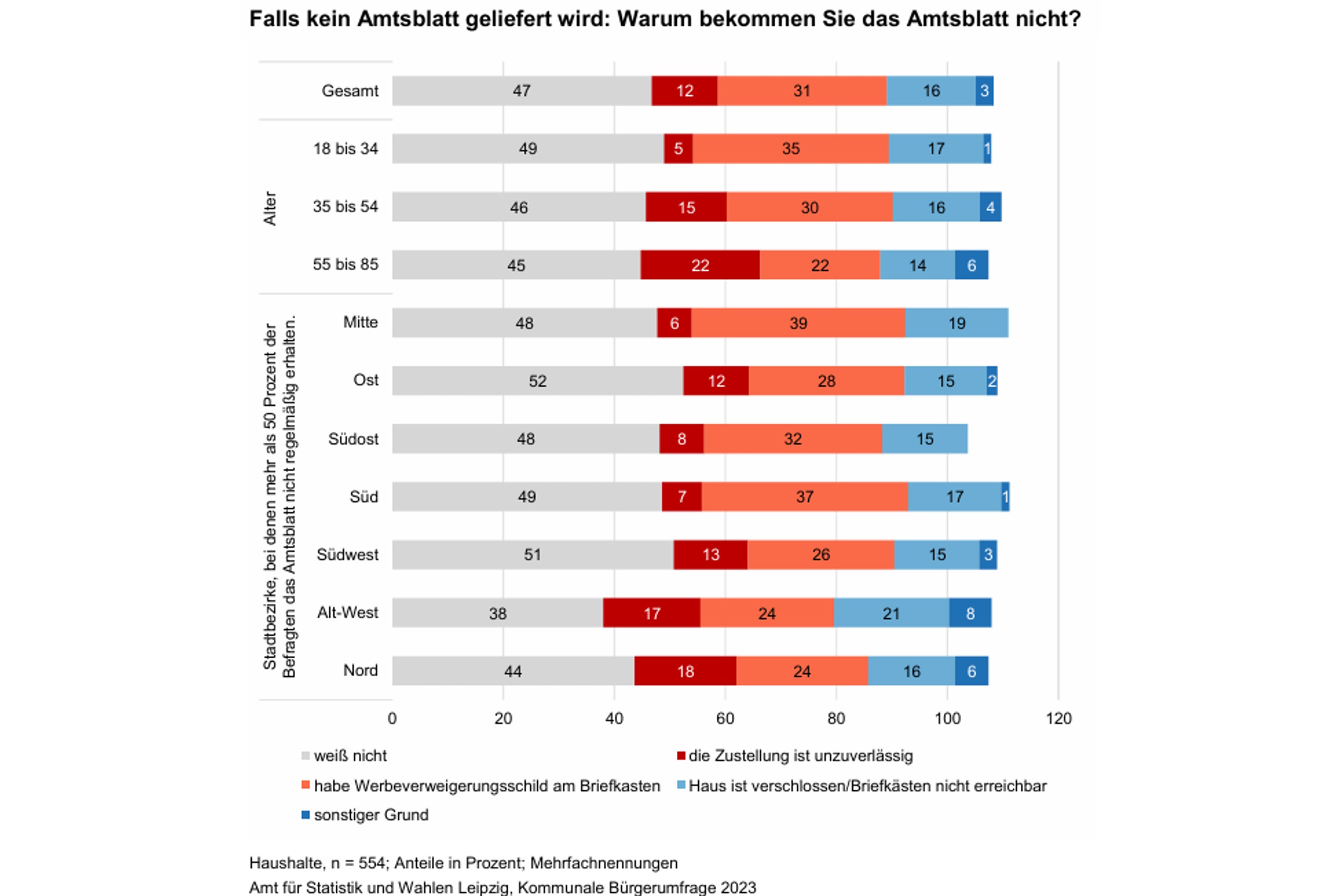„Bei 60 Prozent der Leipzigerinnen und Leipziger erfolgt die Zustellung des Amtsblatts nicht regelmäßig oder nie“, fasst der Bericht zur Bürgerumfrage das Gesamtergebnis zur Verteilung des Amtsblatts zusammen. „Oftmals wissen die Betroffenen nicht, warum das Amtsblatt nicht geliefert wird. Fast jede/-r zweite Befragte kann zu möglichen Gründen keine Auskunft geben. 12 Prozent derjenigen, die selten oder nie das Amtsblatt erhalten, meinen, dass Zustellung unzuverlässig sei.