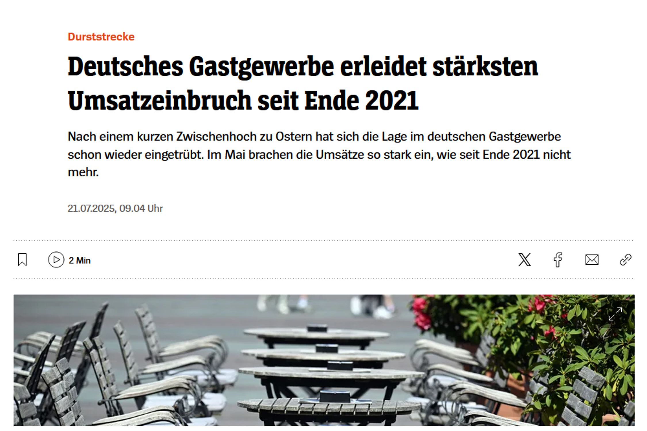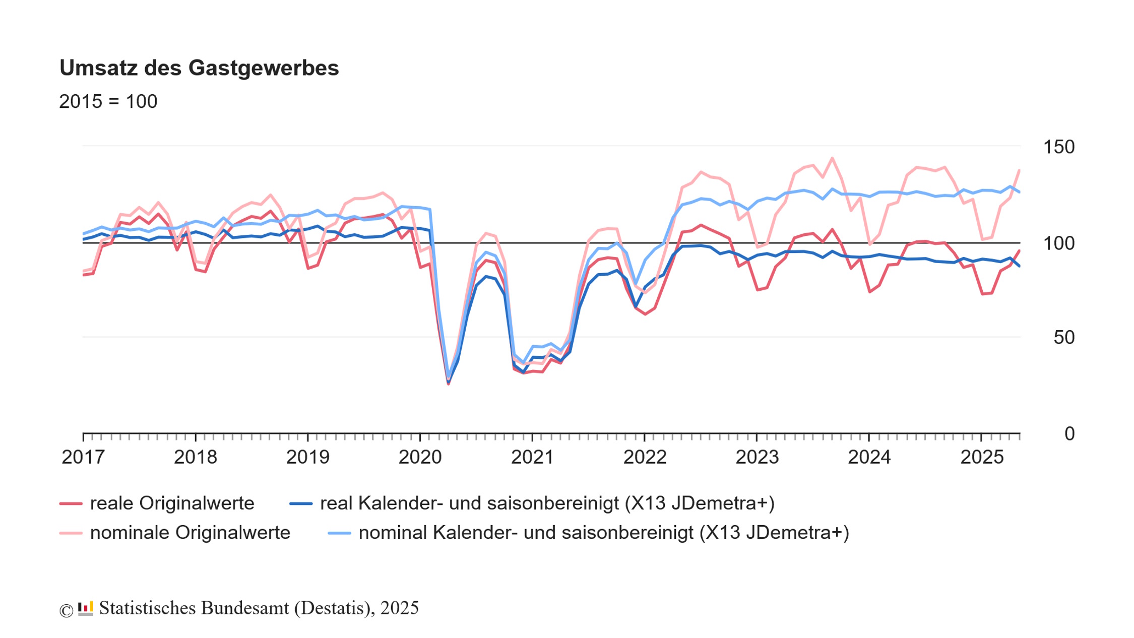 „Im Mai brachen die Umsätze so stark ein, wie seit Ende 2021 nicht mehr“, behauptet Spiegel Online. Aber nicht einmal das stimmt. Im Herbst 2021 rutschten die Umsätze im Gastgewerbe real tatsächlich von 91,1 auf 65,3 Prozent der Umsätze von 2015 ab. Im Mai 2025 ging es nur 91,5 auf 87,3 Prozent runter.