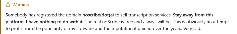 „Jemand hat die Domain noscribe(dot)ai registriert, um Transkriptionsdienste zu verkaufen. Halten Sie sich von dieser Plattform fern, ich habe nichts damit zu tun. Das echte noScribe ist kostenlos und wird es auch immer bleiben. Dies ist offensichtlich ein Versuch, von der Popularität meiner Software und dem Ruf, den sie sich über die Jahre erworben hat, zu profitieren. Sehr traurig.“