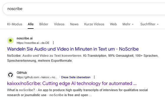 Sucht man jetzt bei Google nach „noScribe“, dann sieht man folgendes Ergebnis.