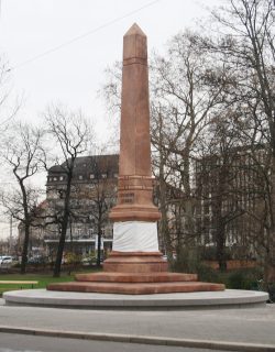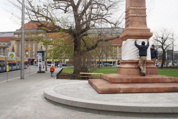 Der jetzt wieder neu gestaltete Platz um den Obelisken ist noch nicht wieder ganz “wie früher”: Rund um das Denkmal ist, wie beim originalen Vorbild, eine gepflasterte Fläche entstanden, auf der einige Bänke aufgestellt wurden. Der Obelisk selbst erhielt wieder das kreisrunde Podest aus Beuchaer Granit. Auf die ursprünglich aufgesetzten Poller und Ziergitter muss vorerst aus finanziellen Gründen verzichtet werden, eine Nachrüstung ist aber möglich, betont das Umweltdezernat.