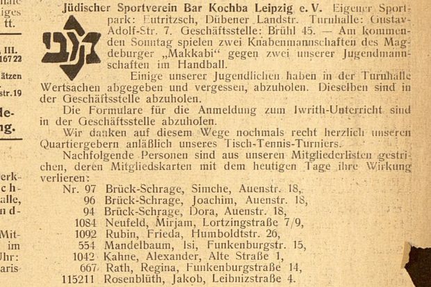 In Leipzig brennt unter anderem die große Synagoge an der Gottschedstraße, auch die Geschäftsstelle Bar Kochba Leipzigs wird heimgesucht, durchwühlt und anschließend zerstört. Bis heute ist das Vereinsarchiv nach diesem Ereignis nicht wieder aufgetaucht, eine Verhaftungswelle rollt auch durch Leipzig. Viele Adressen kommen ausgerechnet aus eben jenen Registern jüdischer Vereine und Unternehmen, nun zu einer sogenannten „Judenkartei“ zusammengefasst. Diese wird nun zum Aufspüren von Mitbürgern durch Polizei und Geheimdienste missbraucht.
