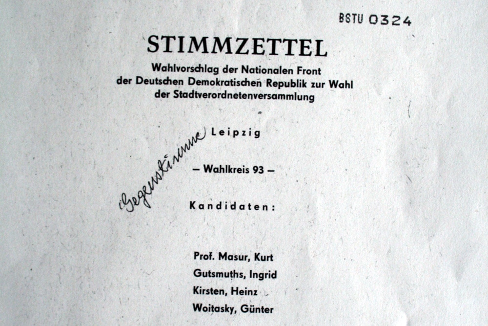 Aber der Dissens war längst allgemein. Und davon erzählen wohl auch einige der von der Stasi gesammelten Wahlzettel. So auch einer für den Wahlkreis 93. Vermutlich Leutzsch, wo Kurt Masur damals lebte. Ein kleiner Wahlkreis mit nur drei Kandidaten und einer Kandidatin. Ein Wähler hat hier mit schönster Schreibschrift „Gegenstimme“ neben die vier Namen geschrieben. Und an oberster Stelle steht Kurt Masur, der also doch noch im Mai für die Leipziger Stadtverordnetenversammlung kandidierte. Und natürlich gewählt wurde. Wer auf dem Zettel stand, wurde gewählt.
