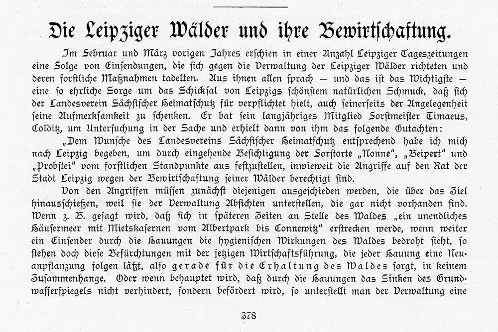 Im Text kann man lesen, nachdem ein anderer Oberförster für den Verein eindringlich erklärt hatte, warum man den Wald „nicht sich selbst überlassen“ dürfe, sondern der städtische Forstverwaltung überlassen werden müsse, „die so viel Sorgfalt an den Tag gelegt und ästhetische Rücksichten walten läßt“: „Ich habe im Leipziger Stadtwald 1882 dienstlich zu tun gehabt und immer im Gedächtnis behalten, daß schon damals die Bewirtschaftung ganz überwiegend und mit ausgezeichnetem Verständnis nach Gesichtspunkten auf Erhaltung und Pflege der Waldschönheit erfolgte und daß finanzielle Rücksichten keine Rolle spielten.“