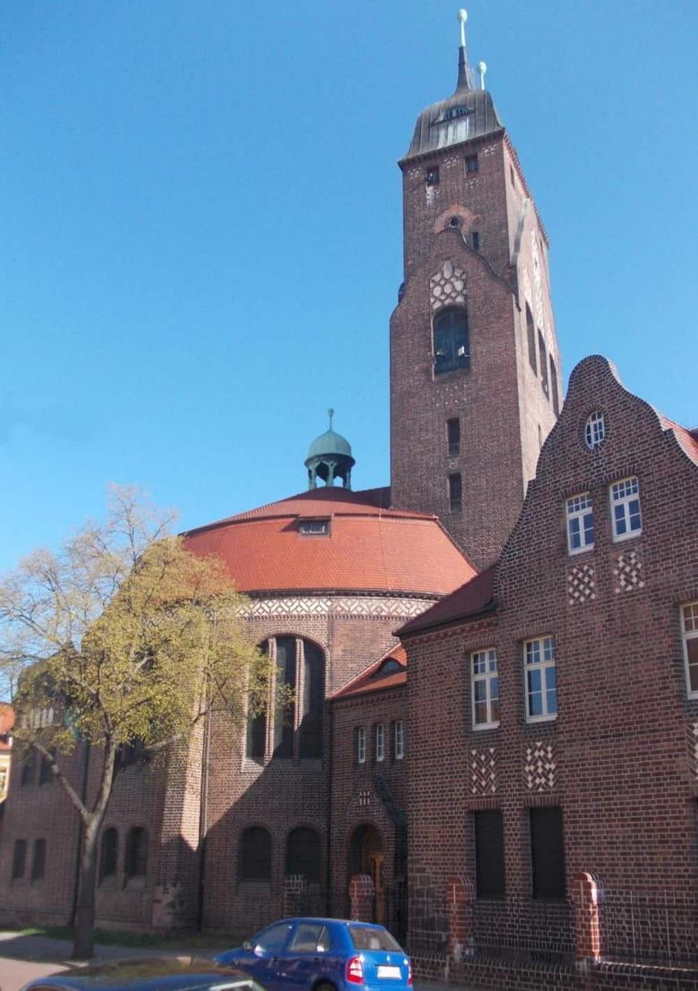 Deren Architekt war Friedrich Gothe (1872–1951): Er entwarf das Kirchenschiff als Rundkuppelbau, an das er an der Ostseite Kirchturm, Pfarrhaus und Kirchdienerhaus anfügte. So entstand ein V-förmiger Grundriss.