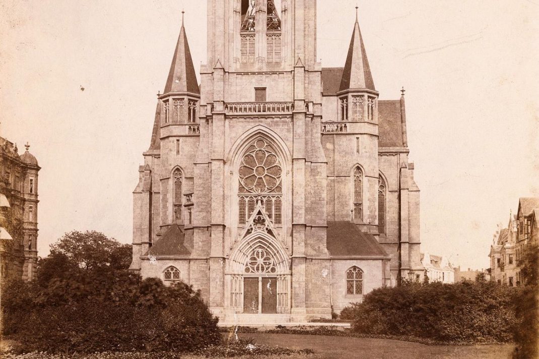 Die in Sandstein gearbeitete, neogotische Kirche hatte folgende Maße: Kirchturmhöhe 72 Meter, Dachhöhe 28,5 Meter, Länge 43 Meter, Breite 30,5 Meter, größte Gewölbehöhe 21 Meter, größte Höhe der Emporenwölbung 4,5 Meter, diagonale Spannweite der Pfeiler des Schiffes 18 Meter, Breite und Tiefe des Kirchenschiffs jeweils 25 Meter. Das Hauptportal war im westseitigen Kirchturm, es gab fünf Seiteneingänge.