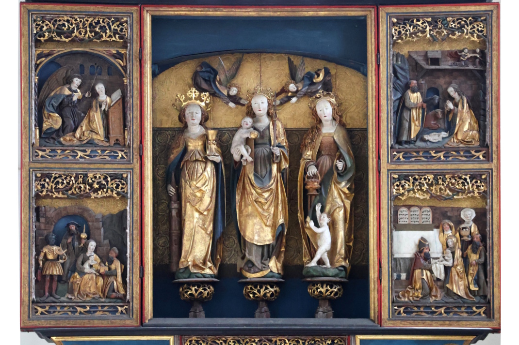 Die ursprünglich nur an Festtagen sichtbaren Schnitzfiguren des Mittelschreins, der Innenseiten des inneren Flügelpaares und des Gesprenges sowie die Predella werden dem mit dem Notnamen „Meister des Flöhaer Altars“ bezeichneten Schöpfer des Altars der Georgenkirche in Flöha zugeschrieben.