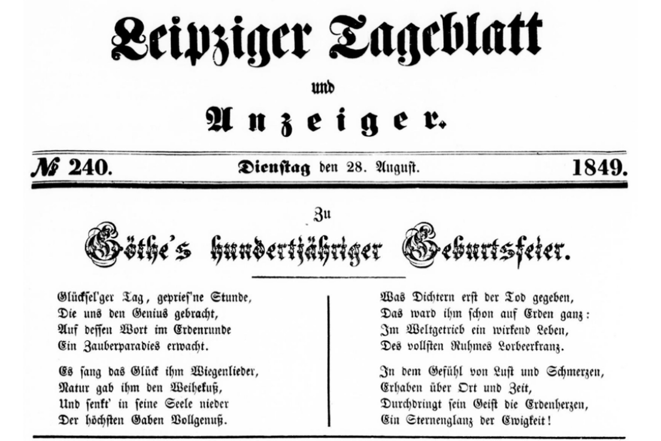 Das Leipziger Tageblatt (LT) begrüßte seine Leserschar am 28. mit einem vierstrophigen Gedicht „Zu Göthe’s hundertjähriger Geburtsfeier.“