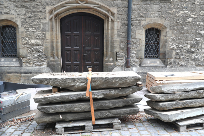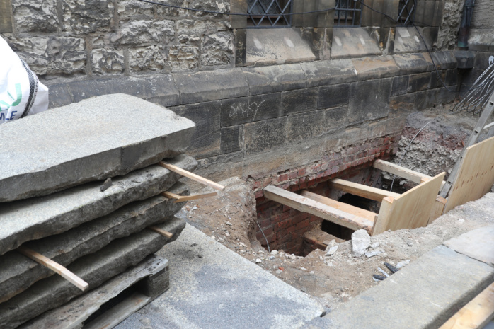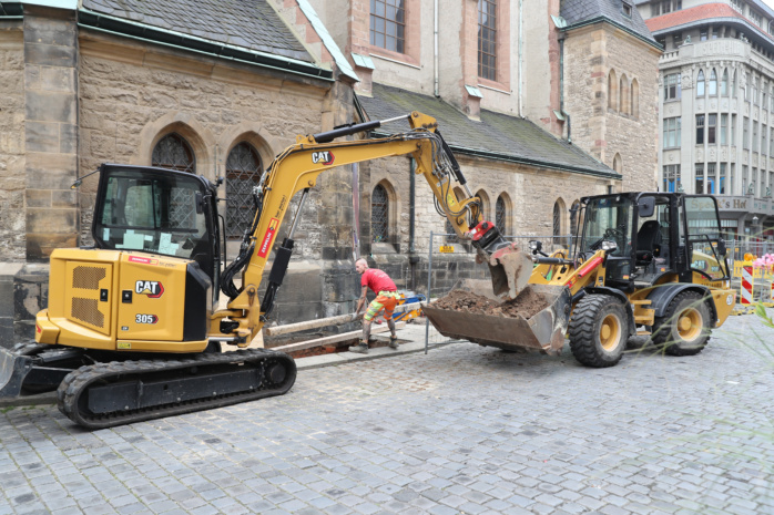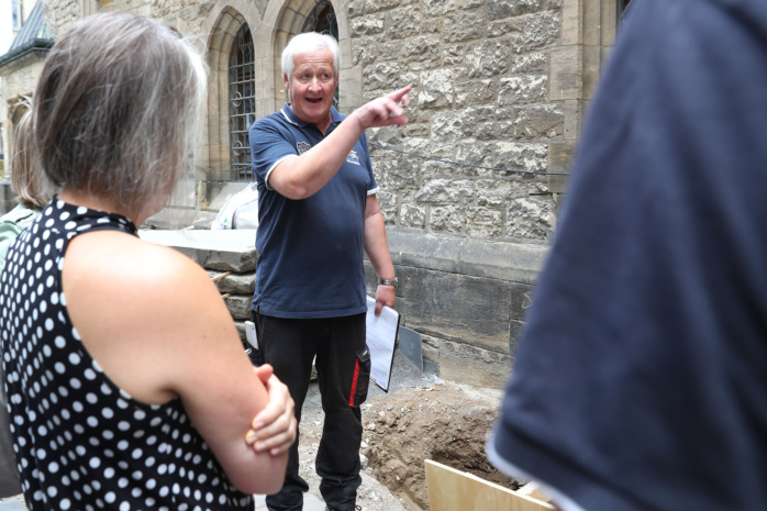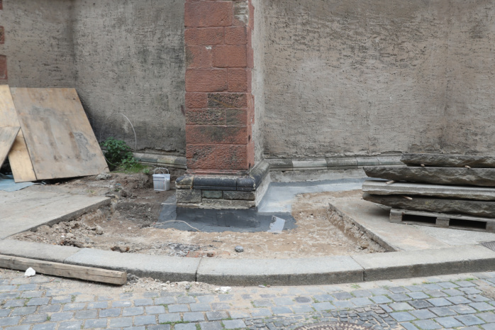 Voraussichtlich Ende September sollen die archäologischen Tätigkeiten dann abgeschlossen sein. Nach der Reinigung der Sockelzone werden die Gruben schließlich mit sogenanntem Flüssigboden verfüllt. Dieses sich selbst verdichtende Material verleiht den Kirchenfundamenten eine substanzschonende Hülle – und hält das historische Gemäuer hoffentlich noch lange trocken.