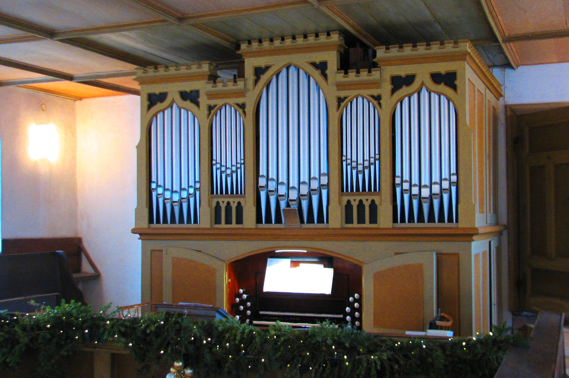Das Orgelgehäuse mit flacher, zinnenbekrönter Fassade und den breiten Spitzbögen der fünf Pfeifenfelder verweist auf den englischen Tudorstil, der im 19. Jahrhundert häufig an repräsentativen Bauwerken Verwendung fand.