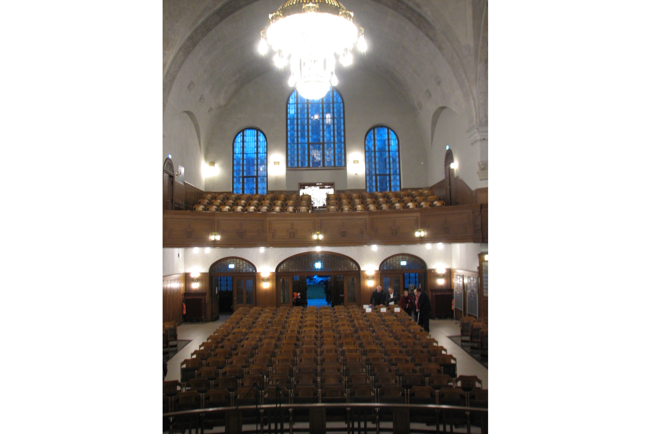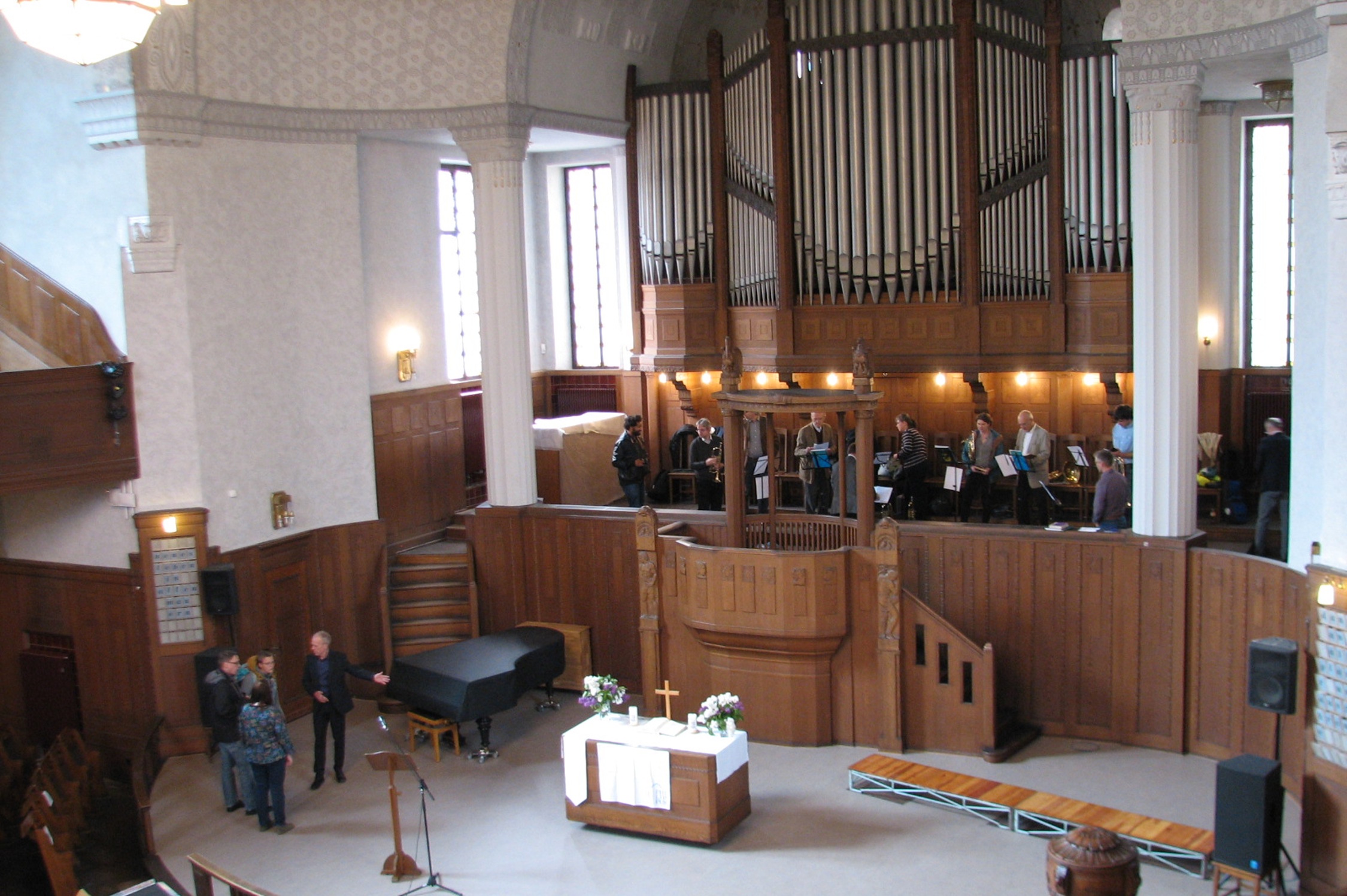 Die Besucher betreten den Raum auf Augenhöhe mit dem Altar. Der Boden fällt in dessen Richtung leicht ab, sodass auch aus den hinteren Reihen ein guter Blick zu Altar und Predigtpult möglich ist. Der Innenraum ist reich mit dezenten Ornamenten geschmückt, die vor allem in Details an Leuchten und Beschlägen zur Geltung kommen.