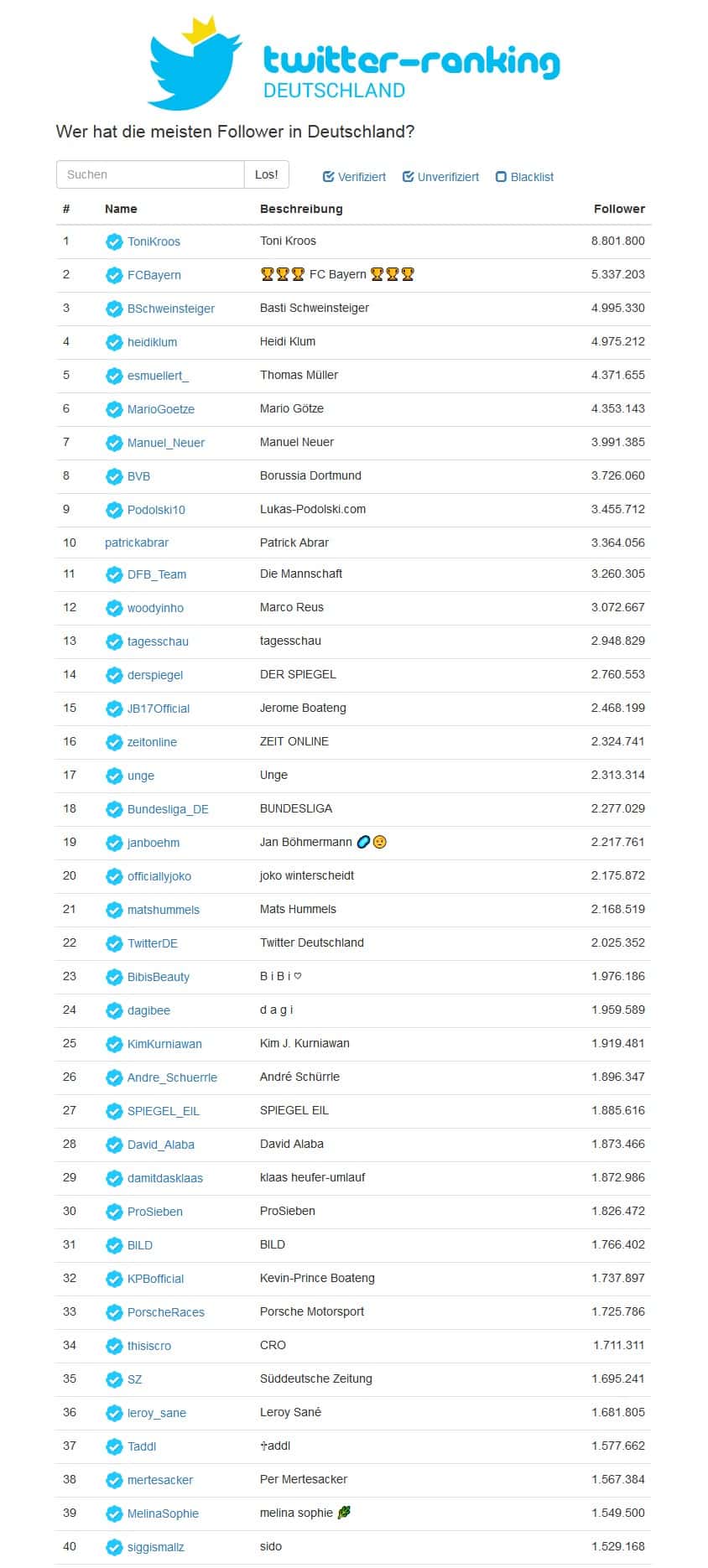 Im Vergleich zu Facebook gilt Twitter durch die hohe Dichte an Politikern, vor allem aber Journalist/-innen und sogenannte „Meinungsmacher“ als das „intelligente Netzwerk“. Wenn man allerdings aus Spaß mal schaut, wer in Deutschland so auf twitter-ranking.de die größten Reichweiten hat, kommt man doch deutlich ins Stutzen.