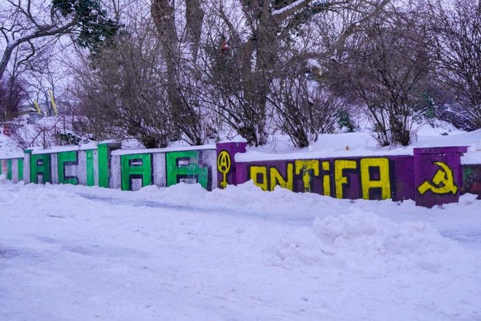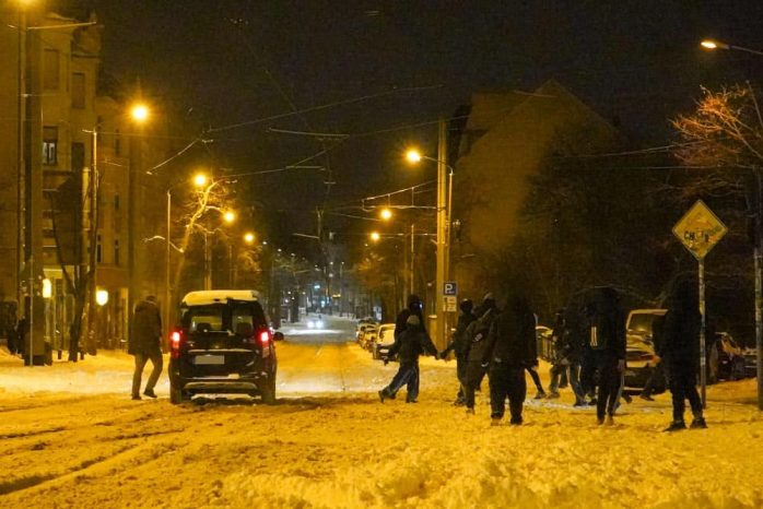Ab 19.15 Uhr lieferten sich bis zu 80 Personen am Connewitzer Kreuz eine angesichts des Neuschnees fast schon ritualisierte Schneeballschlacht. Die überwiegend schwarz gekleideten Teilnehmer bewarfen sich nicht nur gegenseitig, sondern warfen Schneebälle auch auf vorbeifahrende Straßenbahnen und Pkw. Vereinzelt wurde Pyrotechnik abgebrannt.