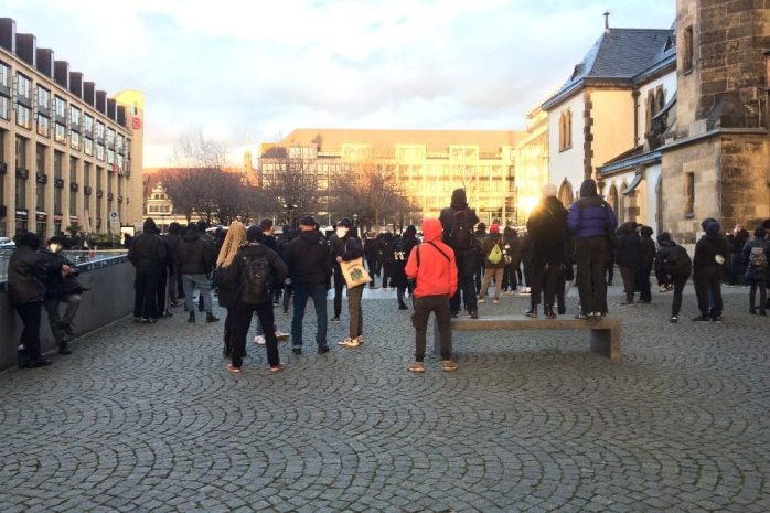 Auch in Leipzig wurde heute, 5. April, zu „Anti-Corona-Protesten“ aufgerufen. Gegen 19 Uhr trafen sich ungefähr 30 Querdenken-Teilnehmende an der Thomaskirche. Aber auch der Gegenprotest war vor Ort: knapp 150 Demonstrant/-innen umzingelten die Maßnahmen-Gegner/-innen.
