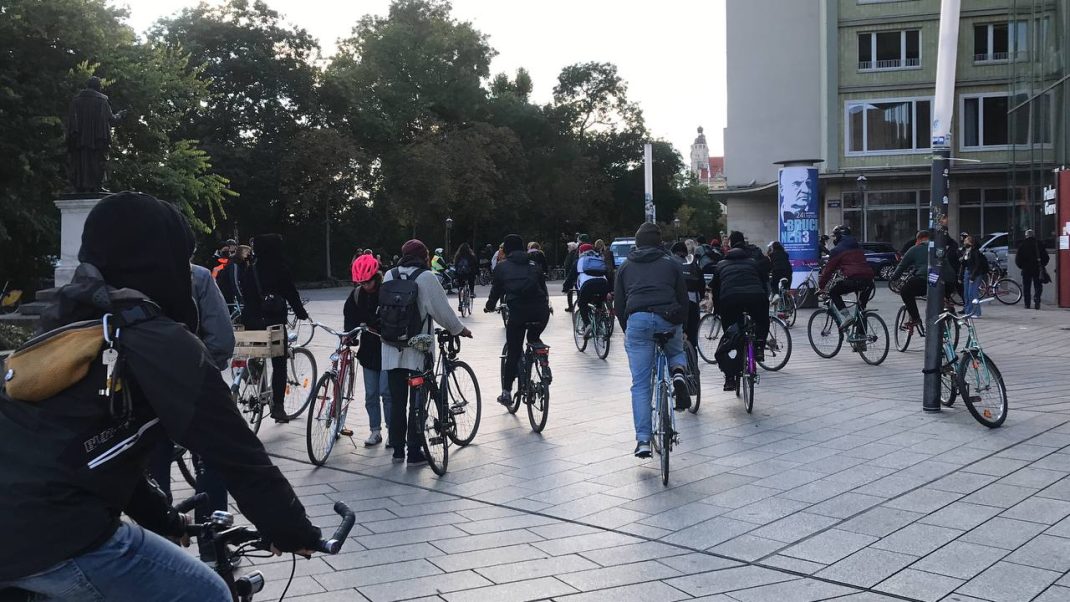 Gegen 15 Uhr versammelten sich etwa 50 Personen am Startpunkt auf dem Kurt-Masur-Platz vor der Moritzbastei. Bevor die Teilnehmer/-innen bei sonnigem Herbstwetter Richtung Richard-Wagner-Platz losradelten, wurde in zwei Redebeiträgen über rechte Orte in und um Leipzig informiert.