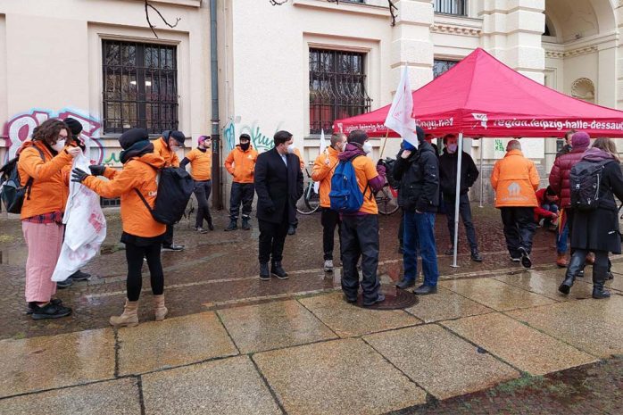 Auch in Markkleeberg versammelten sich wieder Corona-Protestler/-innen. Auch Volker Beiser, „Anführer“ der Bürgerbewegung Leipzig 2021, soll Augenzeugenberichten zufolge vor Ort sein. In der Großen Kreisstadt südlich von Leipzig waren bereits in den letzten Wochen mehrere hundert Menschen zu Aufmärschen zusammengekommen. Auch hier formierte sich eine Gegenprotest-Bewegung am S-Bahnhof Markkleeberg.