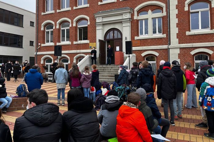Heute Morgen fanden sich bereits die Schüler/-innen und Lehrer/-innen des Maria-Merian-Gymnasiums in Schkeuditz zur Kundgebung zusammen. Auch der Schkeuditzer Oberbürgermeister hielt eine Ansprache vor Ort.