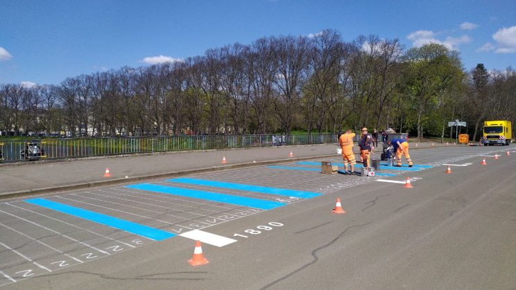 Am 19. April 2022 haben nun die ersten Arbeiten an den „Warming Stripes“ auf der Sachsenbrücke begonnen. Über Ostern hatten die Initiatoren rings um die Parents for Future, Scientists und den Fridays für diesen Start gemeinsam die Straße in diesem Bereich festgetretene Kronkorken und andere Verunreinigungen beseitigt.