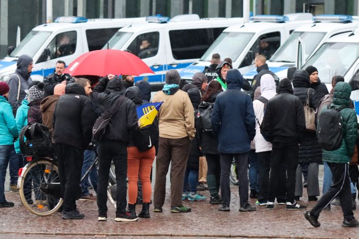 Bezug nimmt das Bündnis damit auf einen Vorfall, der sich am vergangenen Samstag am Rande des Demonstrationsgeschehens in der Innenstadt ereignete: Ein Polizist aus Thüringen soll einem jungen Mann so hart ins Gesicht geschlagen haben, dass dieser für kurze Zeit zu Boden ging. Danach ergriffen mehrere Beamte/-innen den Mann und schubsten ihn fort.