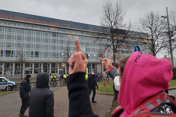 Trotz Regen und Sturmböen versammelten sich einige Menschen zur Kundgebung und Demonstration ab 18 Uhr auf dem Augustusplatz. Wie viele Personen insgesamt am Gegenprotest gegen einen Aufzug von Anhänger/-innen der Querdenken-Szene teilnahmen, ist nicht genau bekannt, da sich die Versammlung am Augustusplatz rasch auflöste und anschließend in mehreren Gruppen den sogenannten „Spaziergang“ teils lautstark begleitete.