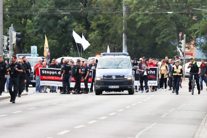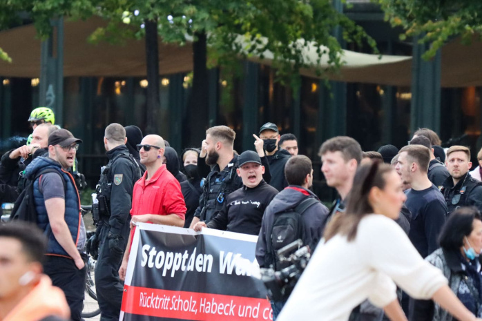 Dabei fanden sich nach einem Aufruf des polizeibekannten Versammlungsanmelders Lucien W. etwa 50 Personen, teils aus dem extremistischen Spektrum der sogenannten „Neuen Stärke“ ein, um die Rücktritte unter anderem von Robert Habeck zu fordern oder „Ost, Ost, Ostdeutschland“ zu skandieren.
