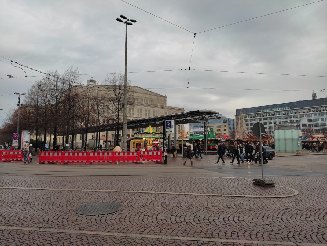 die beim Weihnachtsmarkt zugebauten Leitstreifen für blinde und sehbehinderte Menschen,