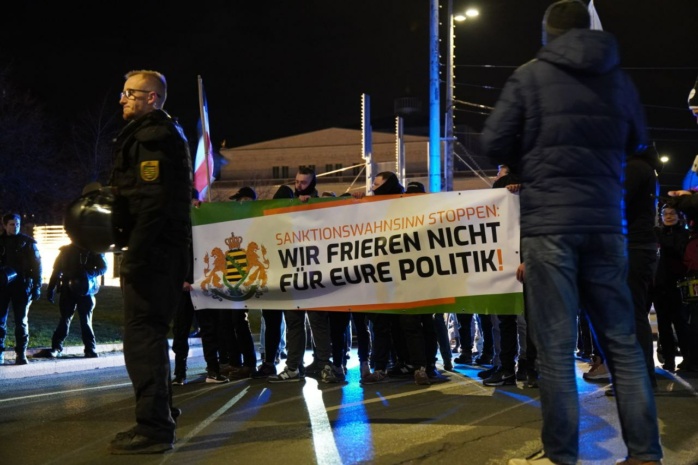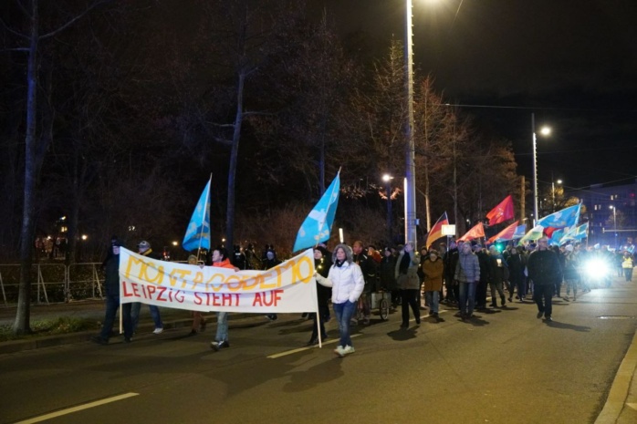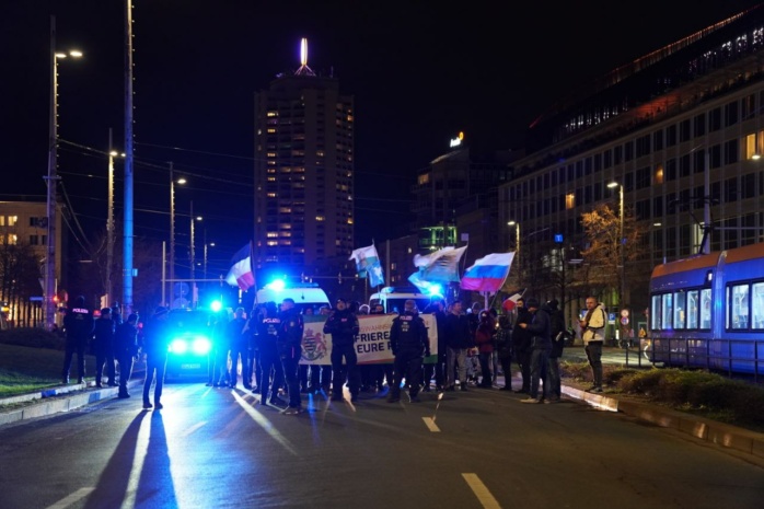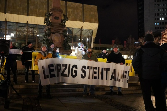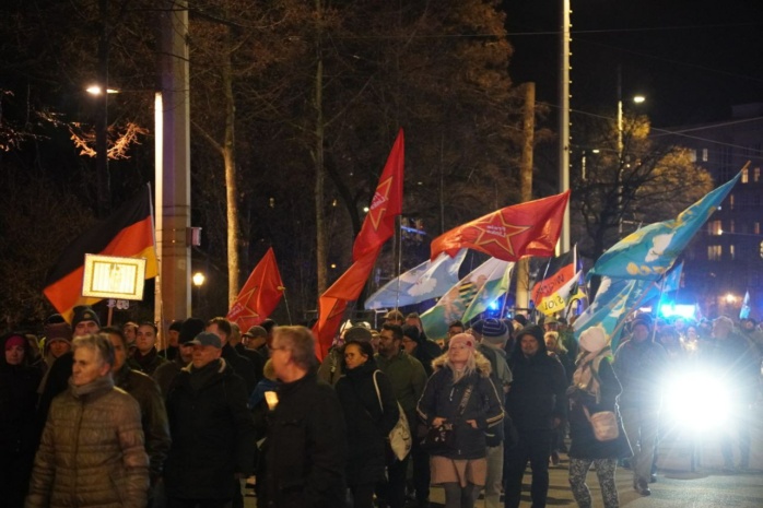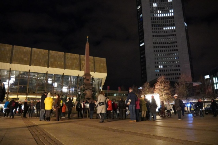 Den Anfang mit dem allwöchentlichen Marsch auf dem Leipziger Ring machte heute Abend das Gefolge von Bernd R., welches inzwischen auf etwa 200 Teilnehmende gewachsen war. Es folgten die Teilnehmenden der Veranstaltung Beisers, ihnen dicht auf den Fersen Anette H. und ihre Anhänger/-innenschar, die auf etwa 30 Personen geschrumpft war. Während auf dem Ring gelaufen wurde, startete am Richard-Wagner-Platz der Gegenprotest mit etwa 100 Teilnehmenden.